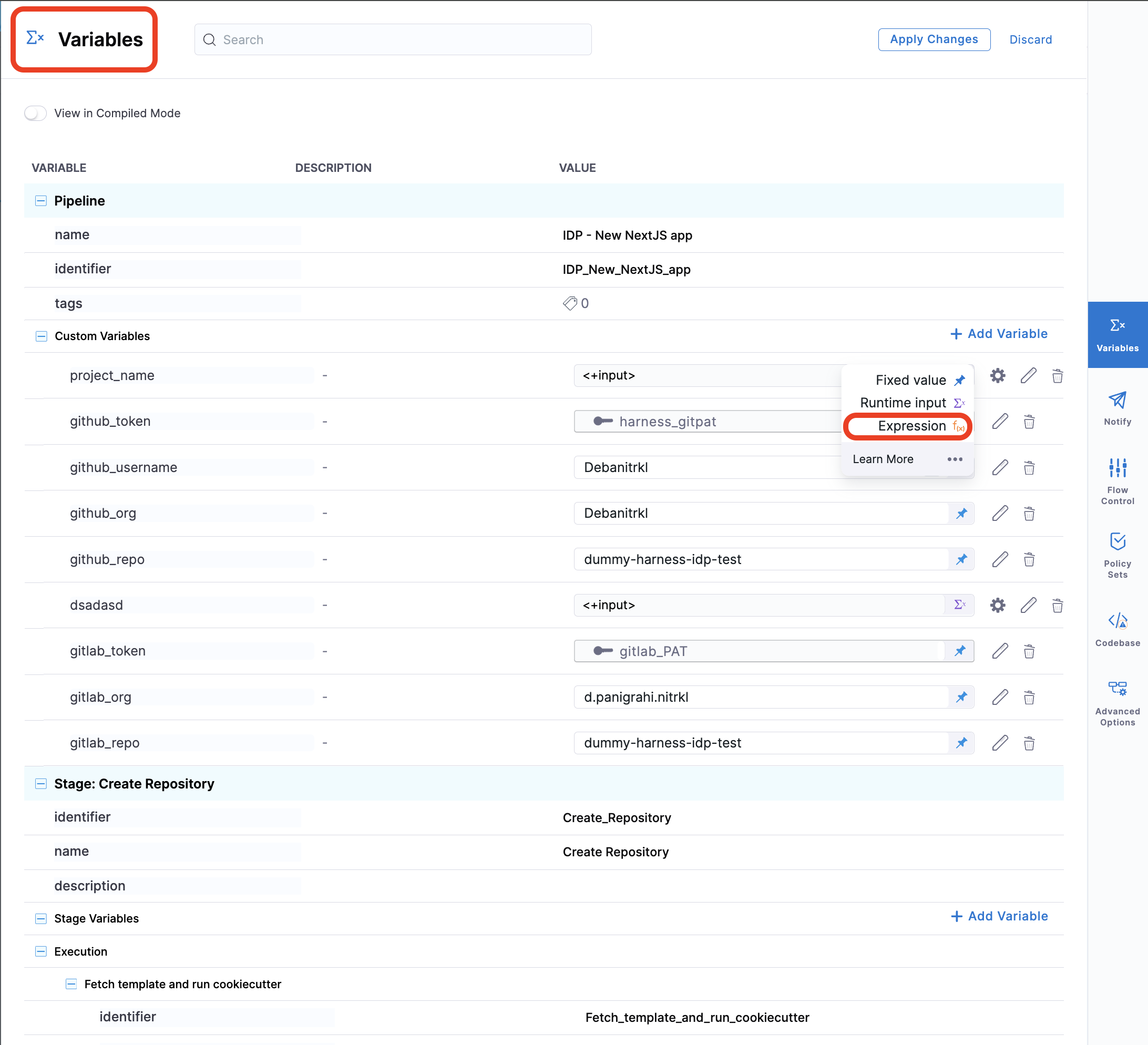 You can create any number of pipeline variables and decide their value type. Some variables, such as a GitHub token, a user name, and organization, can have a fixed value. The token used in the code above is a Harness secret whose value is decoded during pipeline execution.